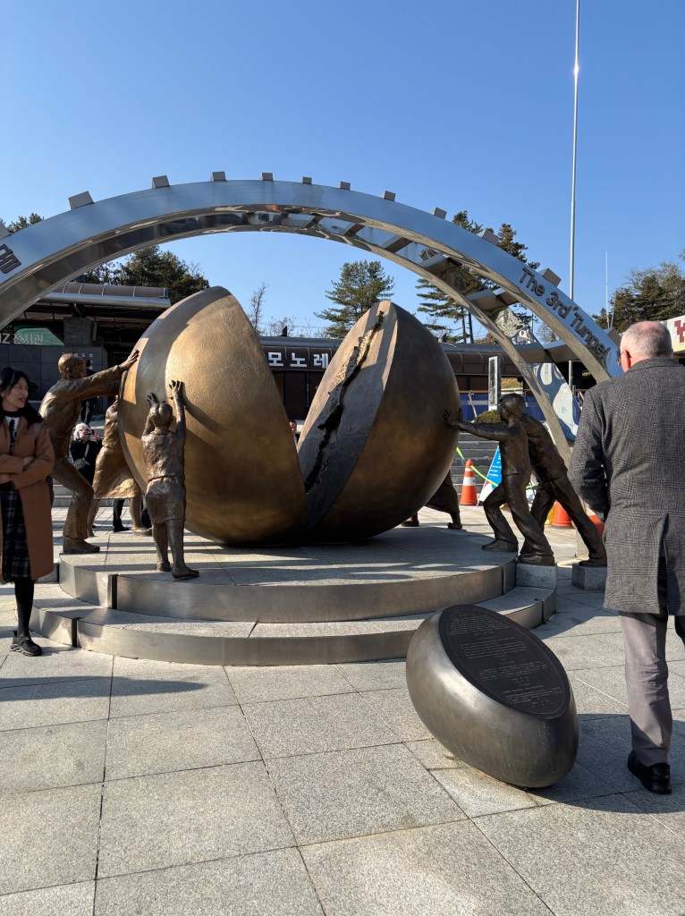 This was the monument that explains it all. On one side is North Korea and on the other side is South Korea. They are trying to push them together.
